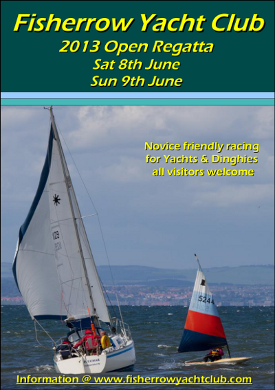 Regatta - 8th/9th June 2013The 2013 Fisherrow Regatta will take place over the weekend of 8/9 June with classes for yachts and dinghies. This is traditionally a small and friendly regatta, though still keenly contested. Competitors are welcome from neighbouring clubs and from farther afield.After the boats come off the water on Saturday there will be hot food. The prize giving with light refreshments will take place after racing on Sunday and of course the bar will be open. Note: competitors' briefing is at 1300 on Saturday.